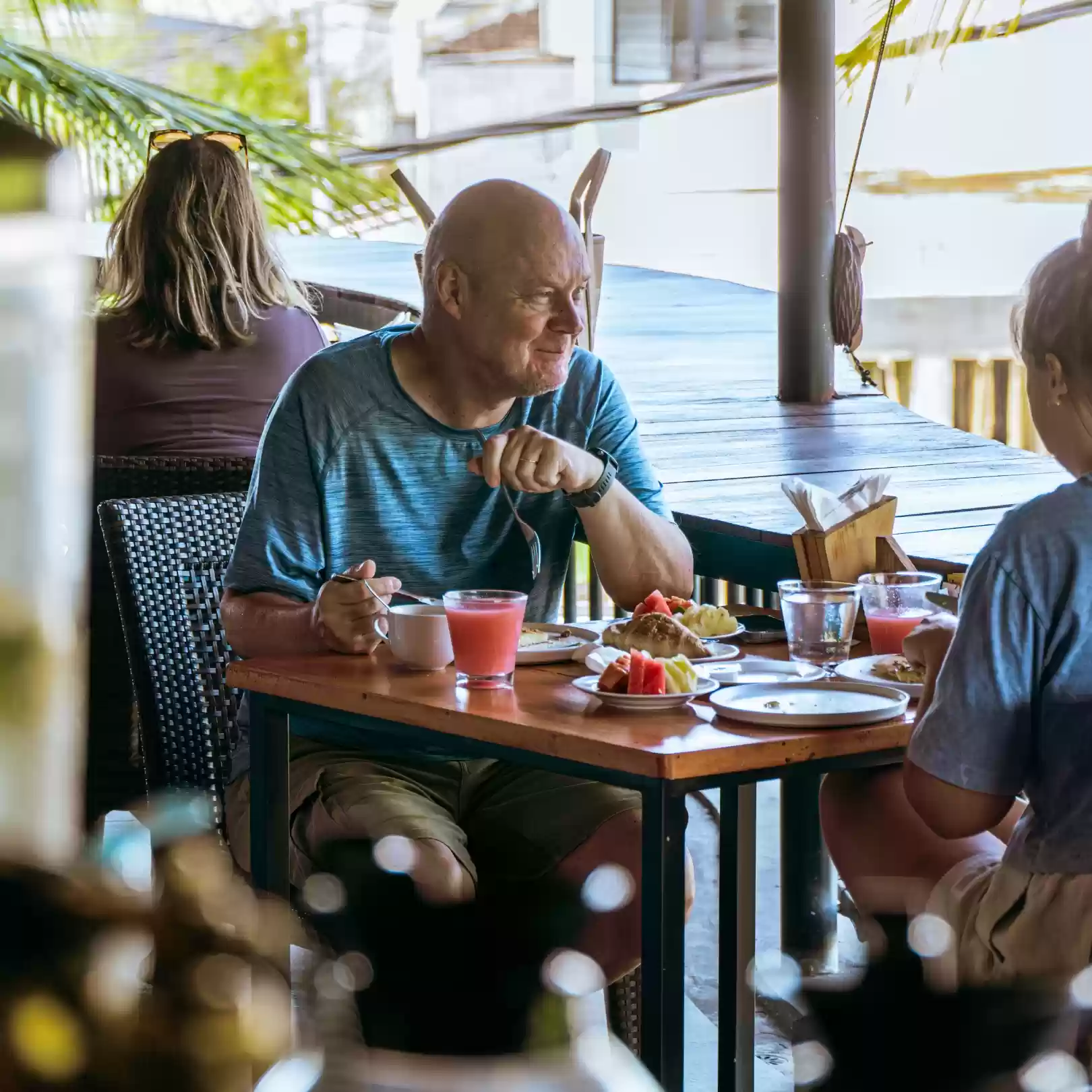 Meals here feel light and social. Breakfasts stretch into long mornings. Lunch becomes a pause. Evenings invite shared plates and refreshing drinks under the open sky.